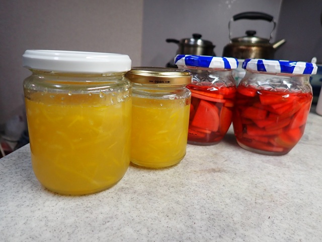 Although I worked outside today, I didn’t take a picture. The photo below is bottles of lemon jam and red-radish pickles. I made the lemon jam yesterday.