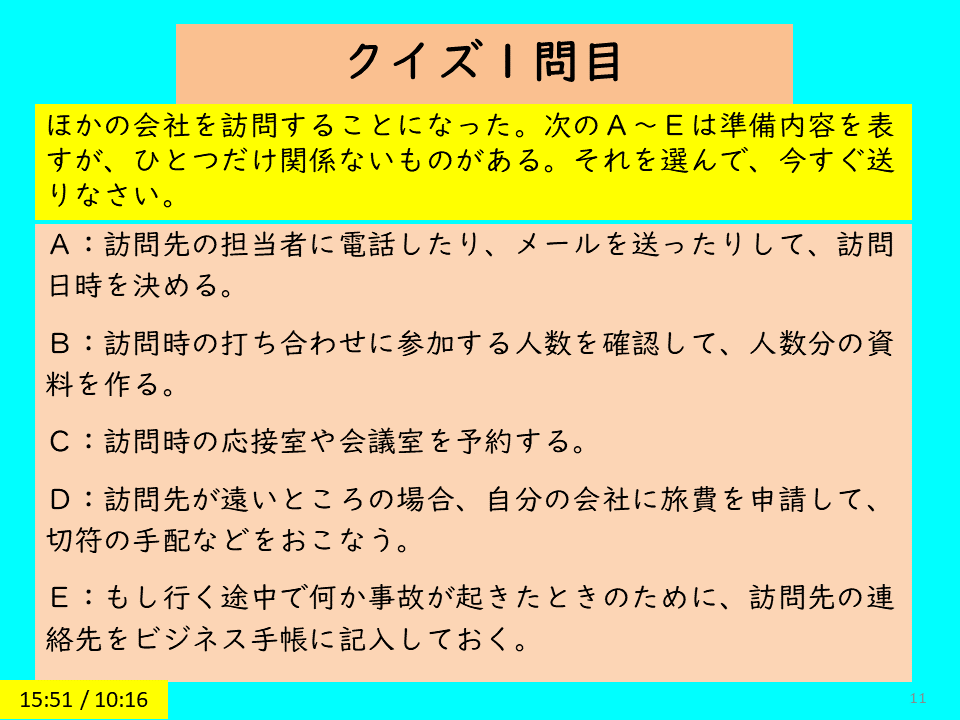 1問目:C:他の会社を訪問する場合であるから、応接室や会議室の予約は相手方がすることである。