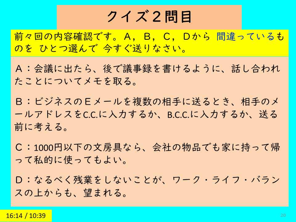 2問目:D:十分な時間的余裕を持って、早めに会議会場へ行くこと。行ってみたら机の並べ方がいつもと違うなどということはよくある。