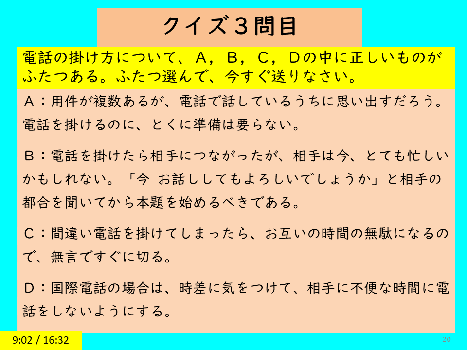 2問目:D:電話をしたいと思ったときに、名刺を捜すことで時間を無駄にしてはいけない。名刺フォルダー等にきちんと整理して、必要なときにすぐ見られるようにしておく。