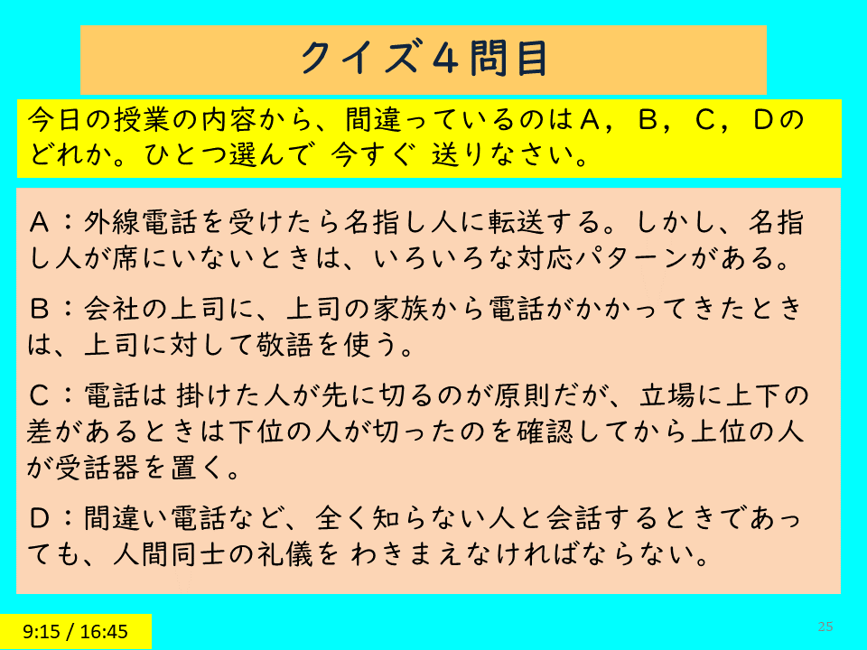 クイズの3問目は、教科書の34ページの演習問題3の問2を使用した。ここに掲示することは著作権法上適切でないと考えられるので、掲示しない。