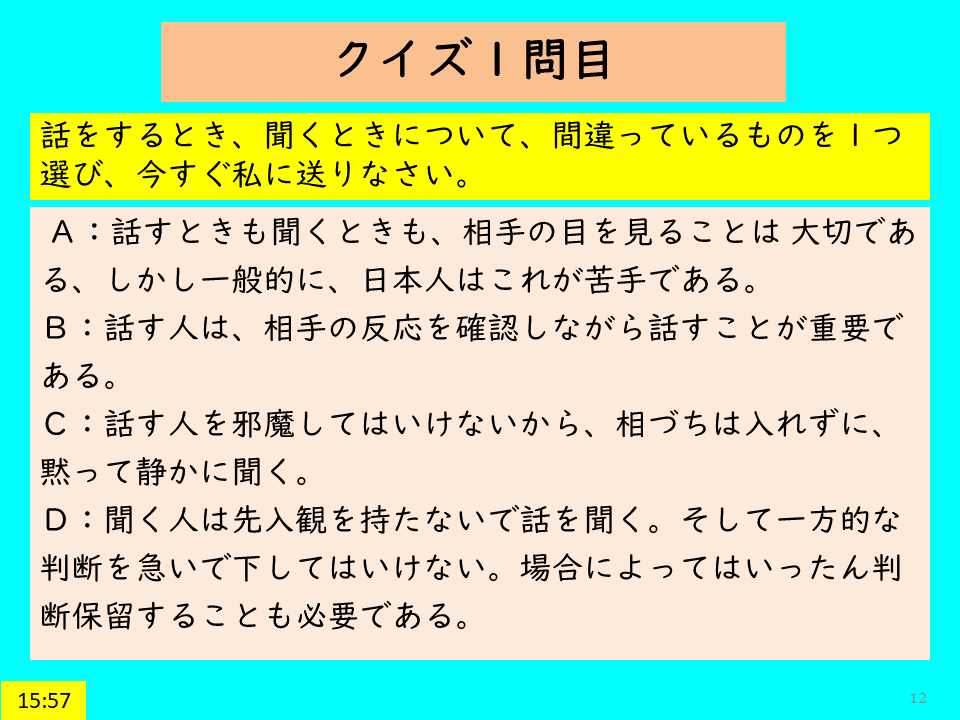 1問目:C:話している人に対して、聞いている人は、適度に相づちを入れて、「あなたの話を聞いていますよ」という意思表示をする。話し手の邪魔にならないように黙ってばかりいると、話し手は聞き手が聞いているのか心配になる。