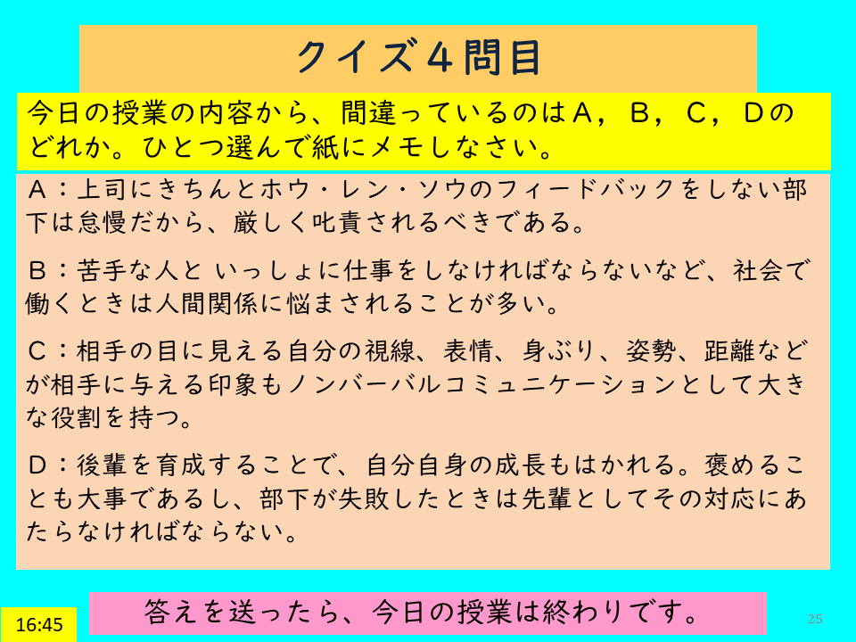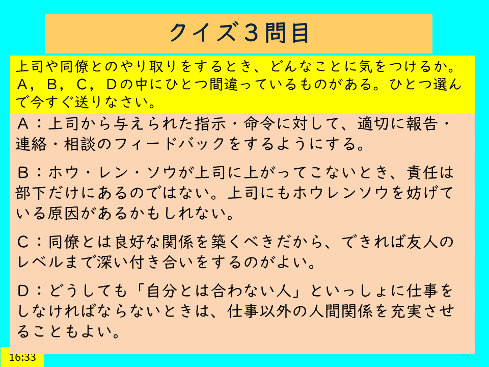 3問目:C:同僚の中に、本当に気の合う人がいれば、一緒に旅行したりする親友になっても、もちろん構わない。しかし、仕事上うまくやって行くために、同僚と友人レベルになる必要はない。おなじ会社の同僚であっても、ときには部署間の利害対立などで、友情がかえって重荷になることもある。同僚という人間関係の距離感がつかめるようになるとよい。本授業においては、Dの記述、「仕事以外の人間関係を充実させる」ことの意義を強調した。