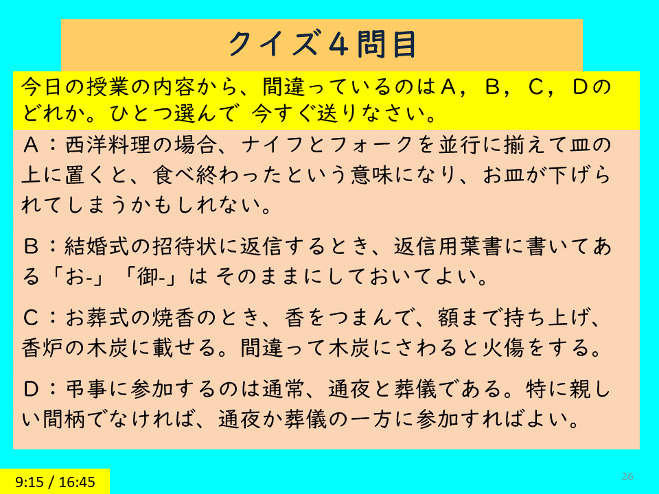 3問目:D:筆や筆ペンのない事態も想定される。太いサインペンなら許容されるか、筆者は知らない。ボールペンはさすがに不可であろう。