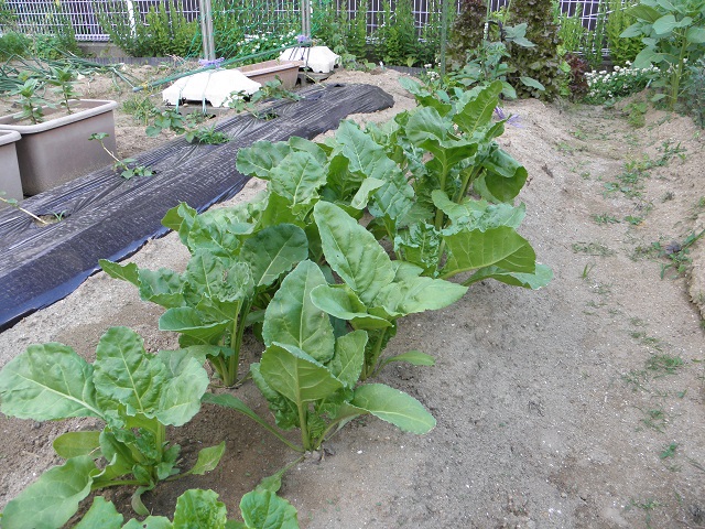 以前、畑の春菊の写真を見せました。その春菊は もう大きくなりすぎて、葉も固くなってきて、終わりみたいです。そこで次はフダンソウ(不断草)です。ホウレン草よりも栽培が簡単で、夏の暑さにも耐えます。そして、害虫の食害を受けることも少ないです。ですから、私みたいなアマチュア園芸家には最適の葉物野菜(はものやさい)です。