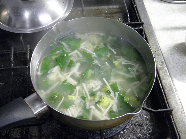 さっそく、白いエノキタケと一緒に味噌汁にしました。茹ですぎは禁物(きんもつ)です。