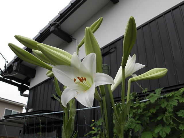 私の庭の写真ばかりですが、白いユリが咲きました。じつは、このユリの球根を買って来た記憶はありません。数年前、雑草の中に1本白いユリがあるのを見つけて、ちゃんとした場所に植え直したのです。ユリの花がラッパのような形をした鉄砲百合の一種だと思います。