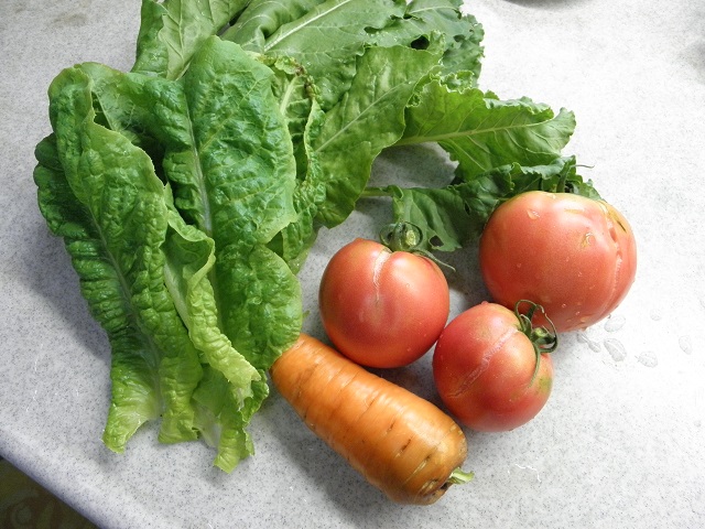 写真は、晩ご飯のおかずにするために夕方 畑から収穫した物です。トマトの表面が ひび割れているのが分かりますか?今日は雨が降って、トマトの皮が破れました。雨があたると、そうなるのです。これでは商品価値がなくなりますから、トマトの生産者はビニールの屋根の下でトマトを育てます。私のトマトは自宅用で商品価値とは関係ないので、雨に濡れてひび割れても、かまいません。ビニールの屋根はありませんし、皮が破れても、そのまま食べます。みなさんはトマトの生産農家がそんなふうにトマトを作っていると想像したことがありますか?