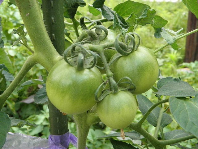 夕方 畑のトマトの写真を撮りました。お店で見るトマトは赤いですが、熟すまでの長い期間、緑色をしています。これを未熟な色として「青い」と言ったりします。もちろん空や海の青さとは違って、色は緑ですが、「まだ青いトマト」などと呼んだりします。