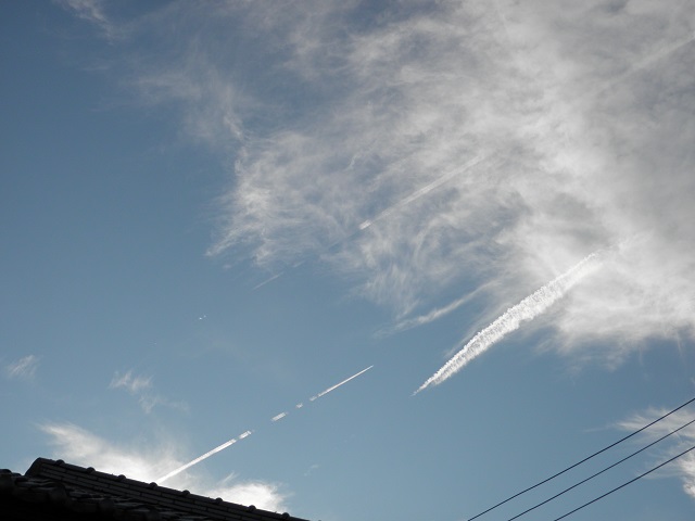 夕方空を見上げたら、飛行機雲が3本見えました。以前のように、人びとが飛行機に乗って、自由に世界を行ったり来たりできるようになれば、いいですね。はやくそんな日が来ることを願っています。