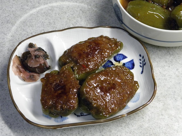 今日は初めて「ピーマン肉詰め」という料理を作ってみました。縦に半分に切ったピーマンの中に挽肉(ひきにく)を詰める料理です。どうやって加熱するのか分からなかったので、ネットで調べました。お肉の面を下にして、つまり、ピーマンを上にして、フライパンで焼くのです。焼くだけだと、中に火が通る前に焦げてしまいますから、途中から調味液を入れて、蒸し焼きみたいに煮るのだそうです。その通りに料理したら、うまくできました。