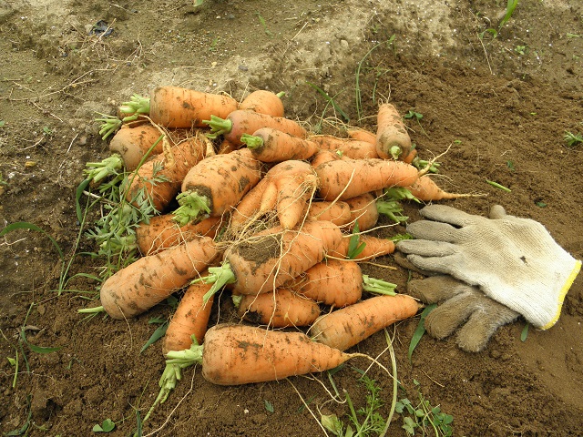 今日はニンジンを掘りました。そのまま畑に置いておくと、ニンジンが割れたり、虫に食べられる部分が多くなります。今日収穫したのは畝(うね)の5分の1くらいです。だから、写真の4倍くらいが まだ畑に残っています。手袋の大きさと比べると、けっこう良いサイズと収穫量だと言えるでしょう(LQ老師は自慢話が多いですね)。