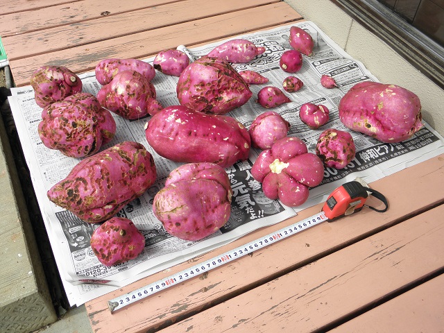 These sweet potato are vulnerable to insect damage because they are improved to have more sweetness. I am wondering how the professional producers, I mean farmers, take a countermeasure against this kind of damage. Do they mix pesticides into the ground? I have never used pesticides to vegetables in my garden, although I do that for some fruit trees.