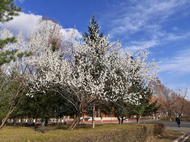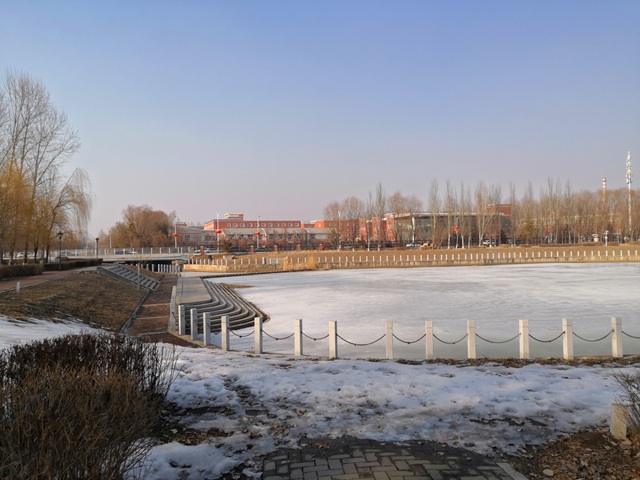 March: The spring semester had started at the time of this photo. There was still ice on the surface of the pond in the campus.